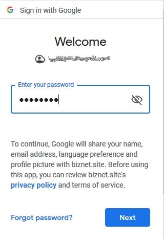 Seterusnya masukkan password akaun Google anda. Seperti yang diterangkan tadi password ini tidak akan didedahkan oleh Google kepada BizNet. Kemudian tekan butang Next.